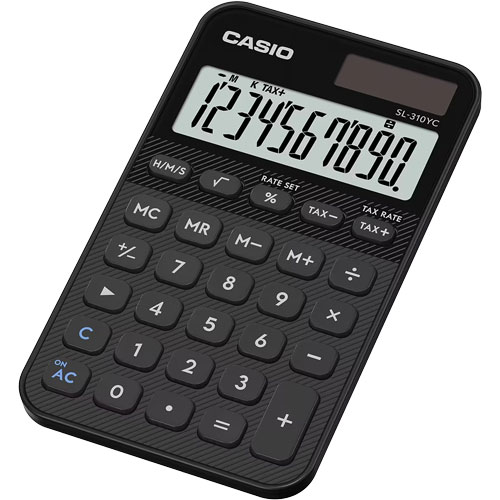 CALCULADORA DE BOLSILLO CASIO SL-310YC-BK COLOR NEGRO DE 10 DÍGITOS, PANTALLA EXTRAGRANDE, CÁLCULO DE IMPUESTOS, MEMORIA INDEPENDIENTE, RAÍZ CUADRADA, COMA CADA 3 DÍGITOS, ALIMENATCIÓN SOLAR Y BATERÍA, CÁLCULO DE TIEMPO, CAMBIO DE SIGNOS Y TECLA SHIFT