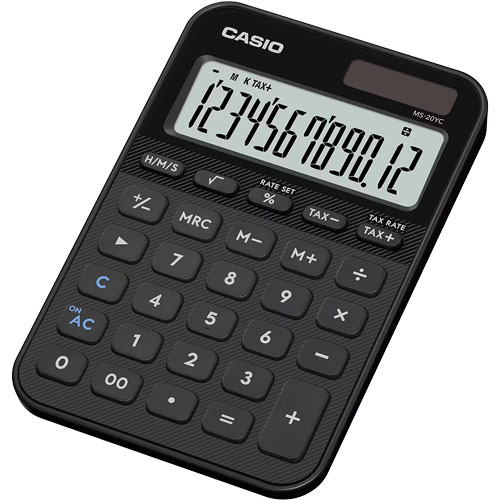 CALCULADORA DE ESCRITORIO CASIO MS-20YC-BK COLOR NEGRO DE 12 DÍGITOS, PANTALLA EXTRAGRANDE, CÁLCULO DE IMPUESTOS, MEMORIA INDEPENDIENTE, RAÍZ CUADRADA, COMA CADA 3 DÍGITOS, ALIMENTACIÓN SOLAR Y BATERÍA, CÁLCULO DE TIEMPO, CAMBIO DE SIGNOS Y TECLA SHIFT