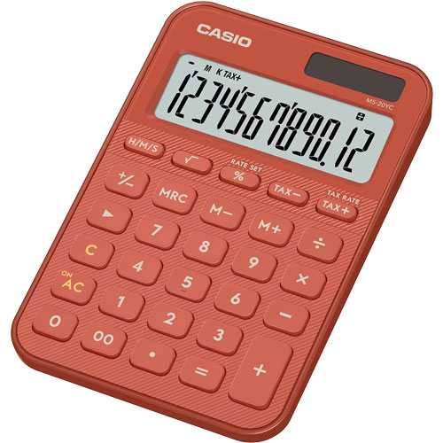 CALCULADORA DE ESCRITORIO CASIO MS-20YC-RD COLOR ROJO LADRILLO DE 12 DÍGITOS, PANTALLA EXTRAGRANDE, CÁLCULO DE IMPUESTOS, MEMORIA INDEPENDIENTE, RAÍZ CUADRADA, COMA CADA 3 DÍGITOS, ALIMENTACIÓN SOLAR Y BATERÍA, CÁLCULO DE TIEMPO, CAMBIO DE SIGNOS Y TECLA SHIFT
