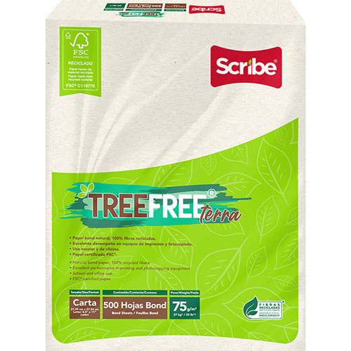 1-Papel bond natural, 100% reciclado con mayor contenido de fibras. Uso escolar y de oficinas. 2-Integrado al programa FSC: Bosques para todos, para siempre. 3-Compatible con todos los sistemas de impresión y fotocopiado. 4-Fabricado con tecnología sustentable para impulsar una economía verde. Este papel contiene un mínimo de 50% de material reciclado y/o de material reciclable y/o fibras naturales no derivadas de la madera y/o de materias primas provenientes de bosques y plantaciones de bosques y plantaciones que se manejan de manera sustentable y/o de sus combinaciones. Además, su procesamiento de blanqueo es libre de cloro elemental (EFC= Elemental Chlorine Free).