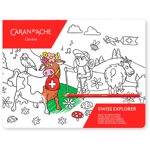 Desde 1915, Caran dAche ofrece a personas de todas las edades y generaciones la posibilidad de revelar su pasion por el arte, les acompaña en sus primeras creaciones expresadas con colorido desde una edad temprana, pensando en estos artistas en desarrollo y apasionados del color, Caran d´Ache propone ahora Swiss Explorer,un divertido poster gigante para colorear, un paseo por las estaciones en un entorno 100% suizo, donde los niños iluminan escenas imaginarias compuestas por niños y animales, los diseños se plasman en un magnifico poster gigante que representa un lindo paisaje Suizo, este alegre entorno suizo toma forma de póster gigante para decorar solo o en grupo antes de ocupar un lugar destacado en su lugar favorito de la casa, para usted o para toda la familia, en casa o de vacaciones, es facil de transportar gracias a su funda de cartón, el poster rinde homenaje a Suiza, con un perro San Bernardo como mascota y muchos animales mas.