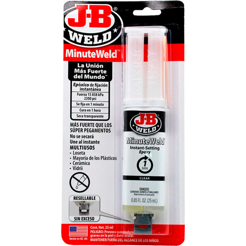 Epóxico de fijación instantánea Minute Weld 25 ml 50101SPA JB-WELD. Minute Weld Es un epóxico de dos partes con fijación instantánea especialmente desarrollado de alta resistencia. Minute Weld se fijará en un minuto en la mayoría de las condiciones de temperatura. Minute Weld está diseñado para adherirse a múltiples superficies y se puede usar en cerámica, loseta, vidrio, piedra, la mayoría de los plásticos, madera y metal. Fuerza: 15 858 kPa ( 2300 PSI) Se fija en un minuto, Cura en una hora, Seca transparente